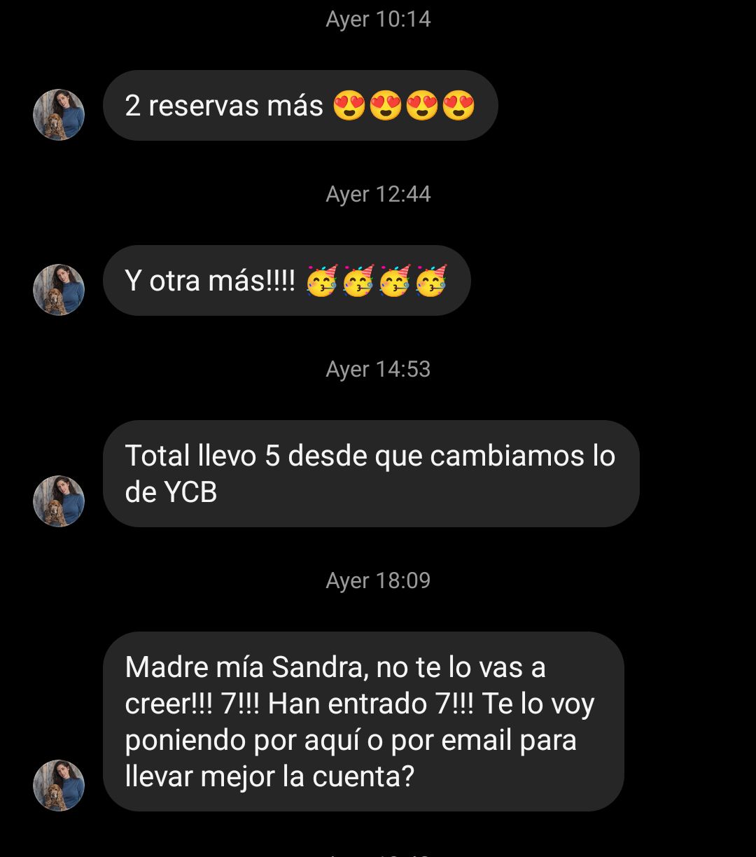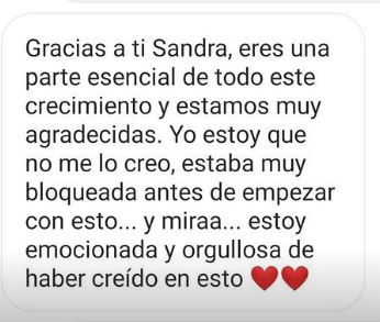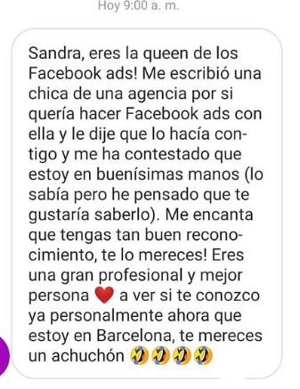 Sandra es de las pocas profesionales de su sector que se atreve a compartir sus resultados. Ha cubierto todas mis expectativas y he pasado de tener una casi sin gente a tener una lista a tener muy en cuenta. He decidido que Sandra siga dentro de mi proyecto porque ayuda a la hora de hacerte visible y a la hora de vender.